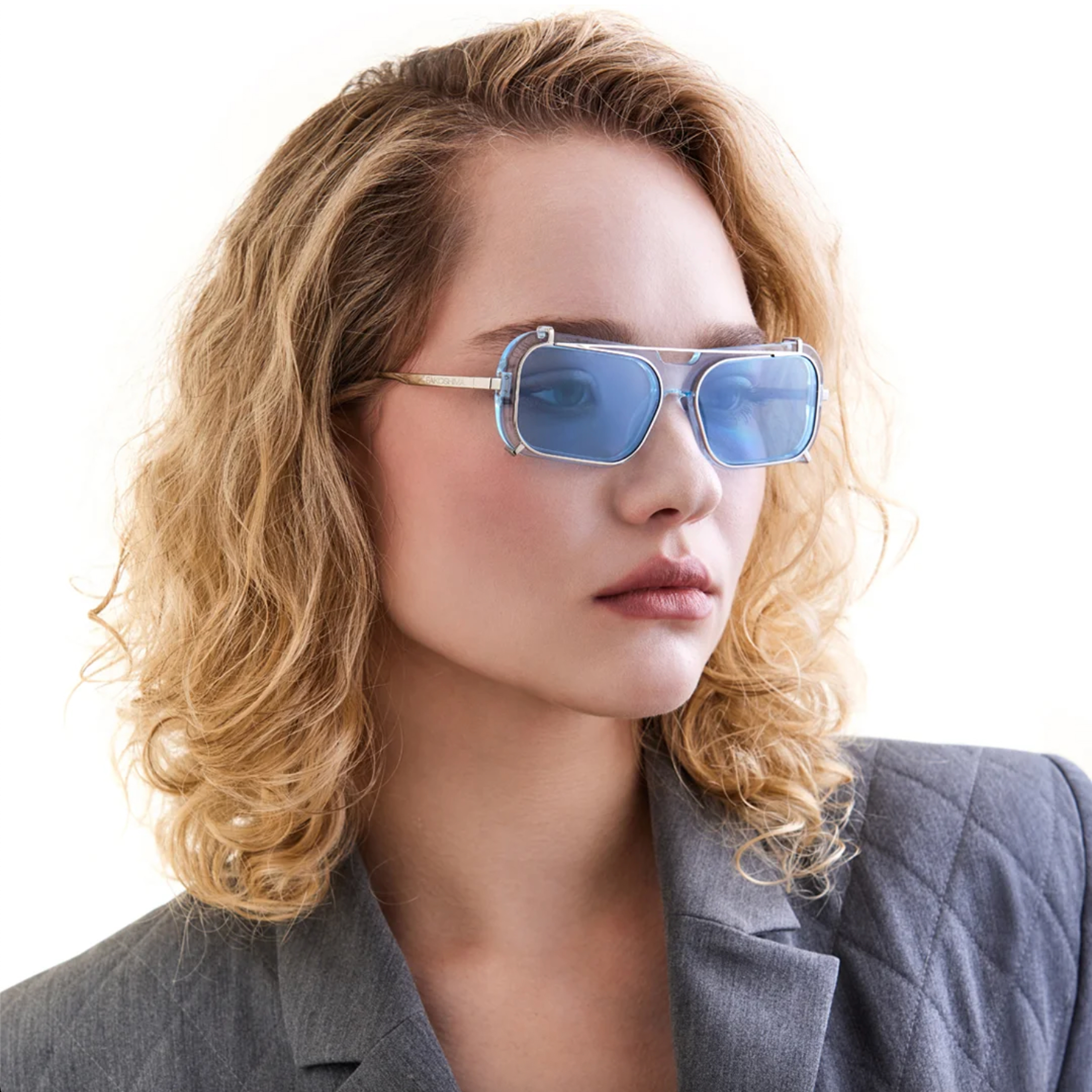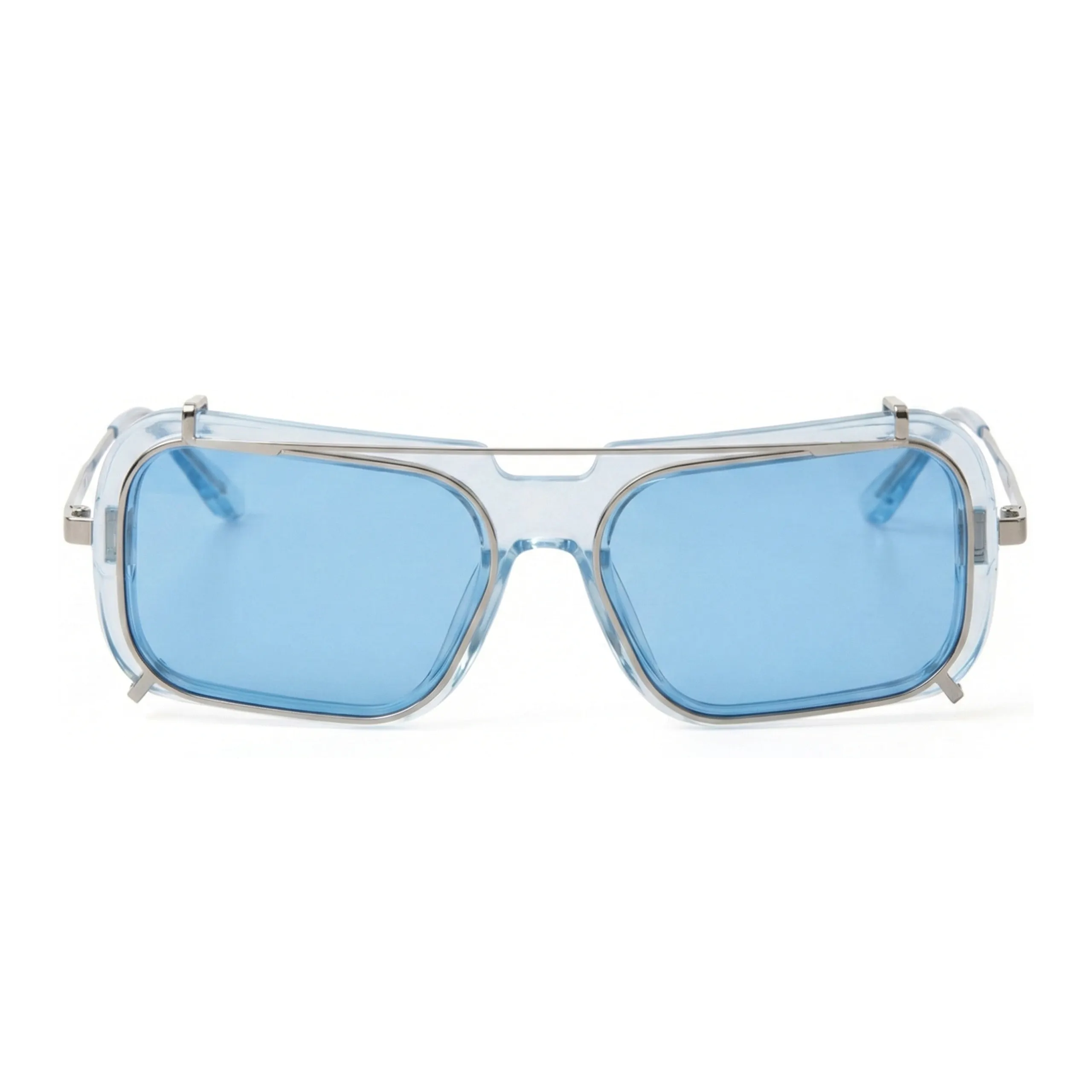Ключевой элемент дизайна — съемный металлический клипон (clip-on), который работает как экзоскелет для оправы. Холодный блеск серебристого металла в сочетании с голубым ацетатом создает сложный, многослойный визуальный ритм, характерный для киберпанк-культуры. Голубые линзы поддерживают монохромную гамму, обеспечивая комфортное, расслабляющее зрение. Это очки-трансформер, позволяющие менять градус эксцентричности образа одним движением руки.