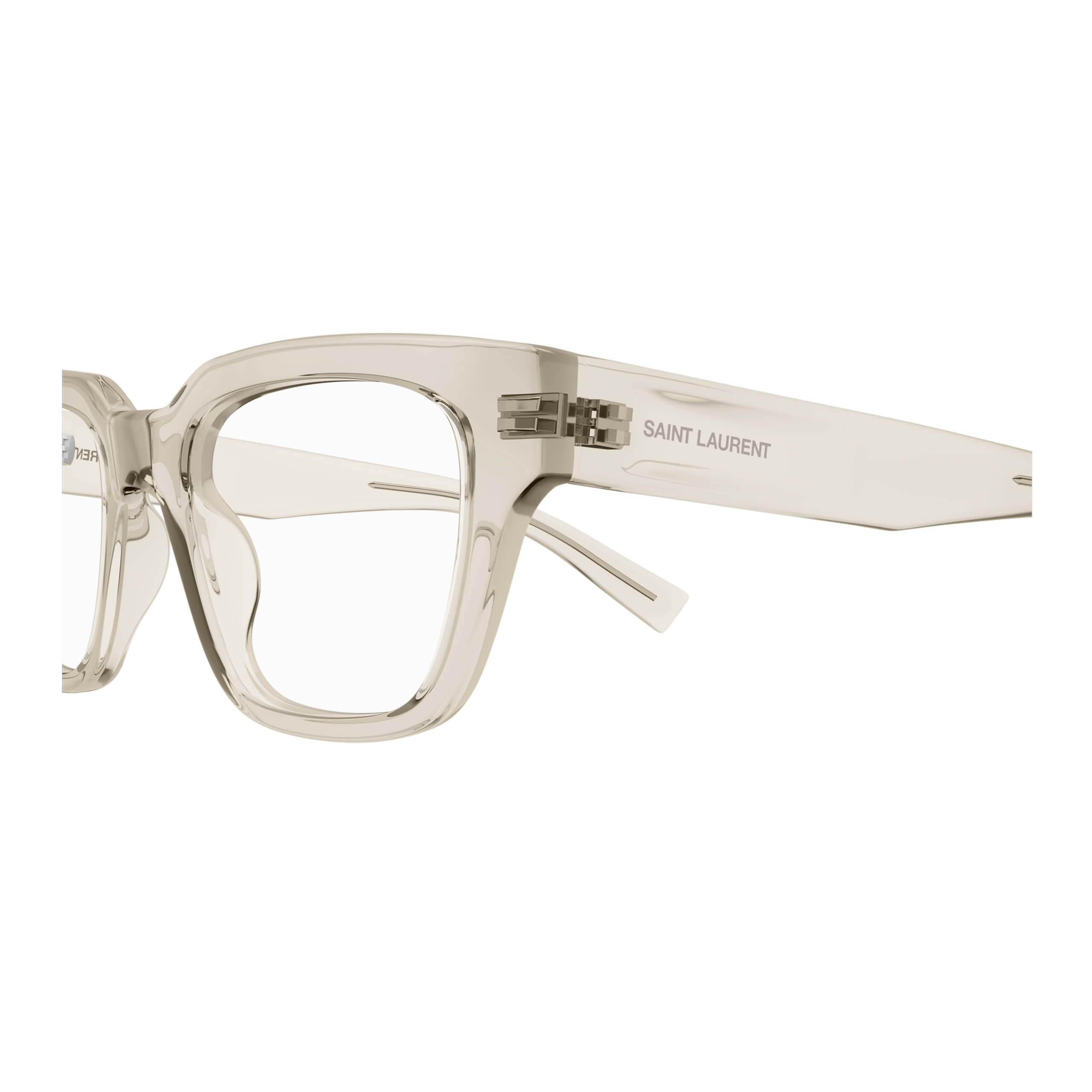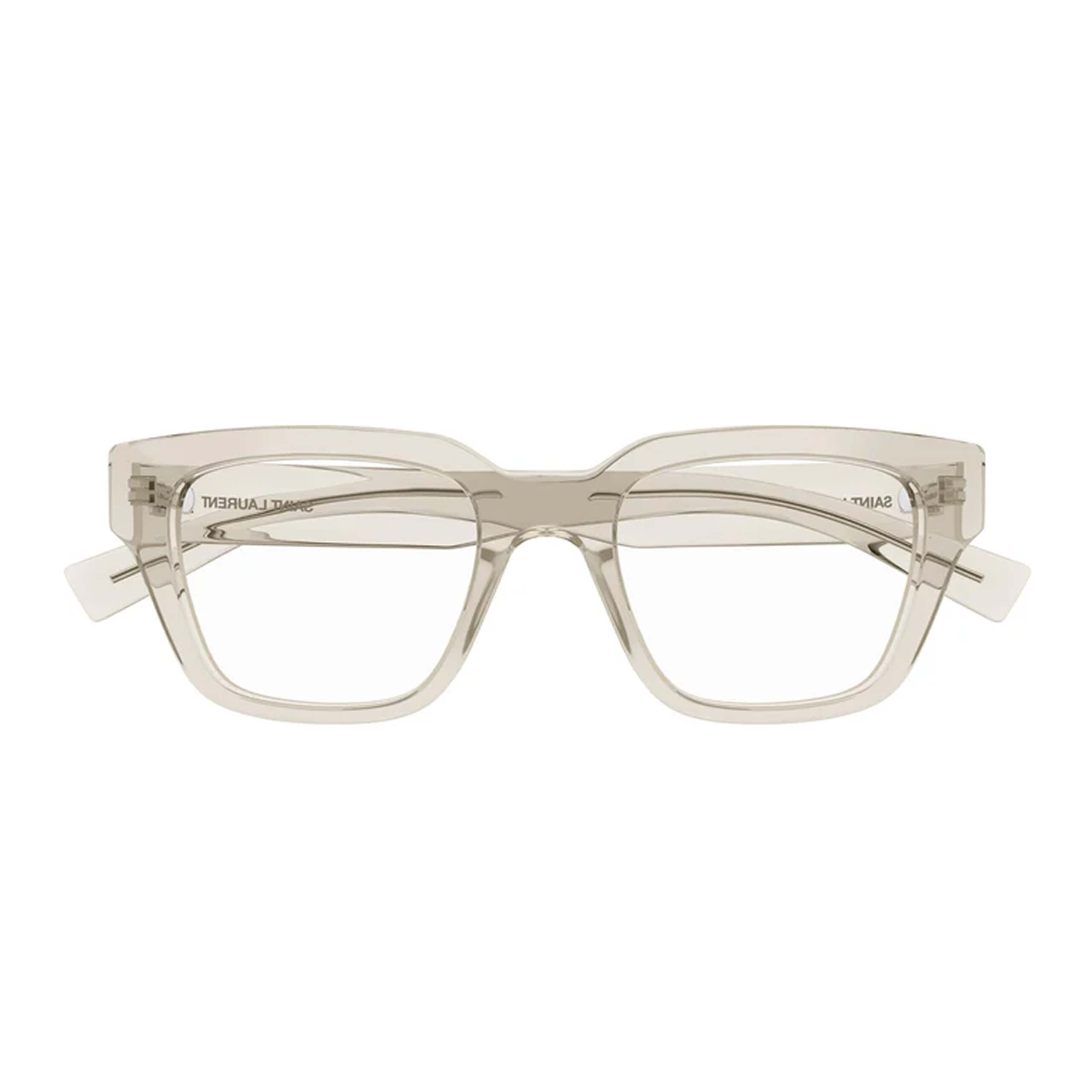Эта оправа в фирменном стиле Saint Laurent объединяет лаконичность формы и выразительность материала. Полноободковая конструкция выполнена из прозрачного ацетата в оттенке «crystal beige», что придаёт модели лёгкость и современную утончённость.