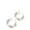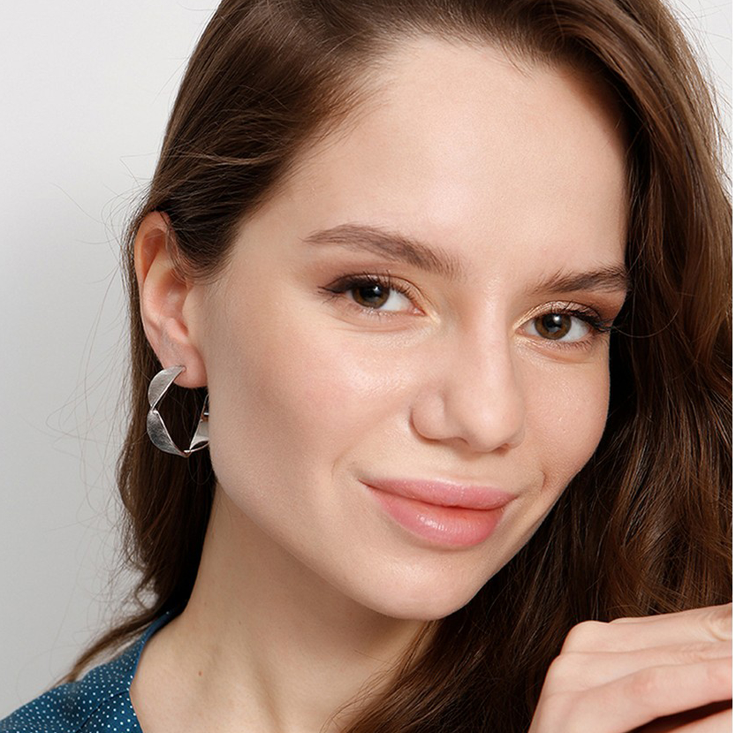 Серьги в форме полуколец выполнены из серебристого металла. Модель сочетает разные фактуры.
